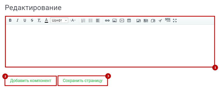 1. В области визуального редактора можно добавить и отформатировать текст, изображения, видео со стороннего ресурса, ссылки и т.д.