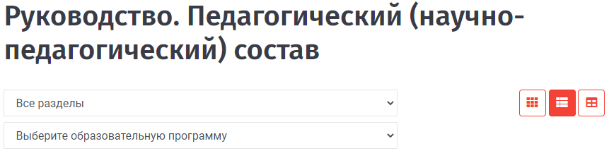- Информация о составе педагогических (научно-педагогических) работников. Над таблицей предусмотрен фильтр педагогических работников по образовательным программам.