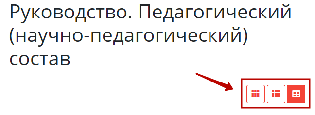 В разделе предусмотрен вывод трех режимов отображения списка сотрудников: табличный режим (согласно рекомендациям о размещении информации на сайтах образовательных организаций), режим списка и режим карточек.