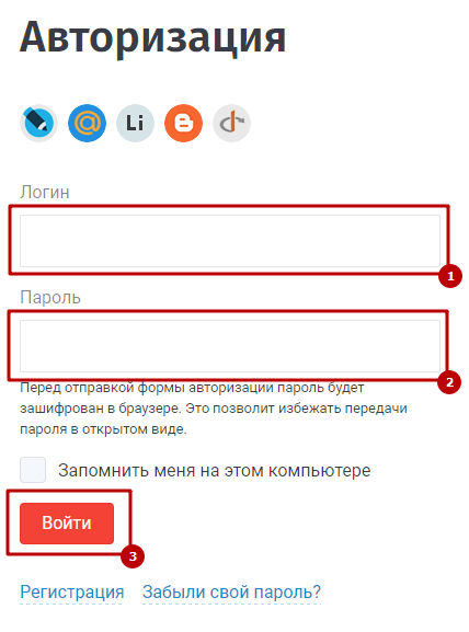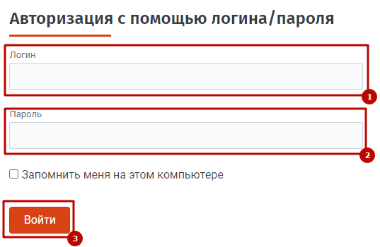 На открывшейся странице авторизации ввести логин (1), пароль (2) и нажать кнопку Войти (3).