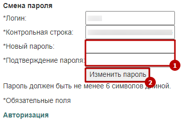 Для этого в полях (1) Новый пароль и Подтверждение пароля необходимо прописать новый пароль и нажать кнопку (2) "Изменить пароль".
