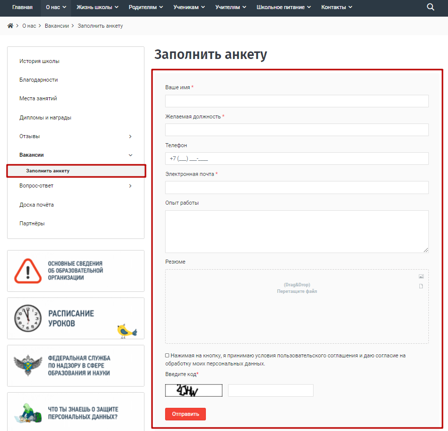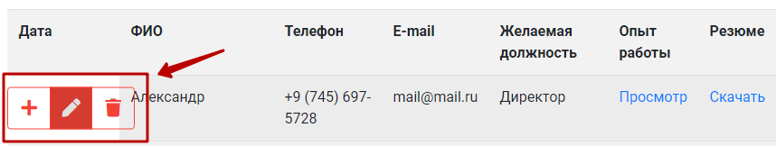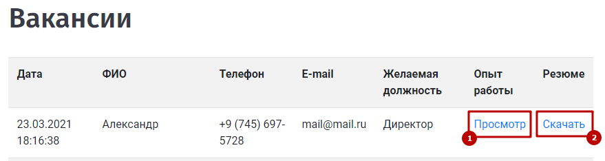 В раздел Заявки на вакансии попадают заявки, отправленные пользователем сайта с формы обратной связи Заполнить анкету: